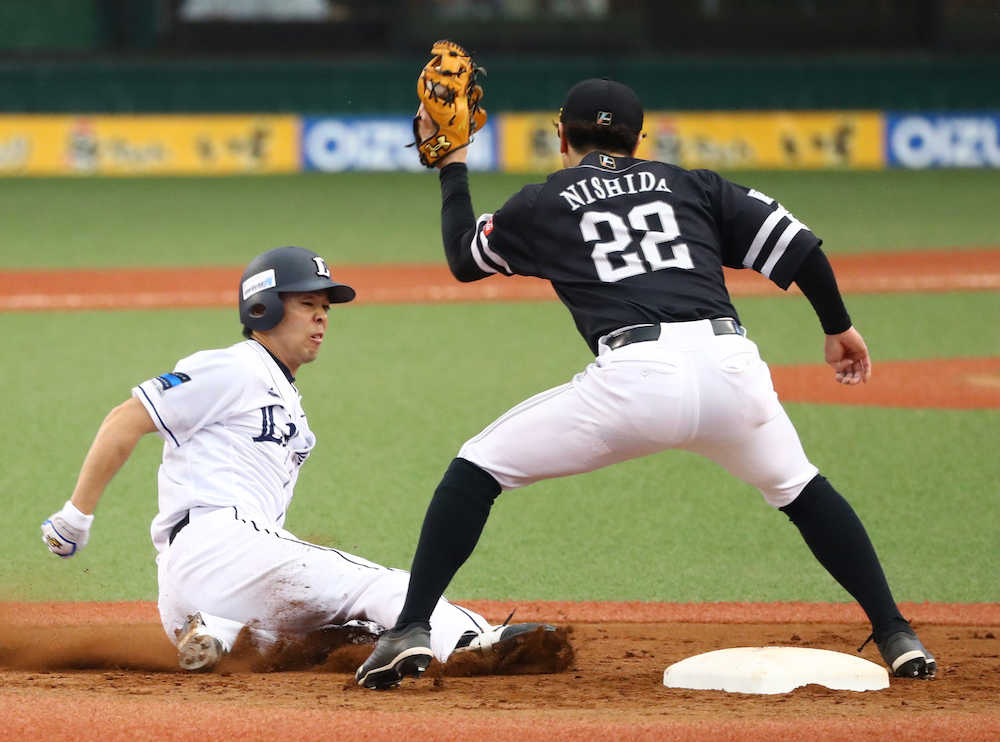 <西・ソ>5回2死一塁から一塁走者・秋山は二盗失敗(撮影・三島 英忠)